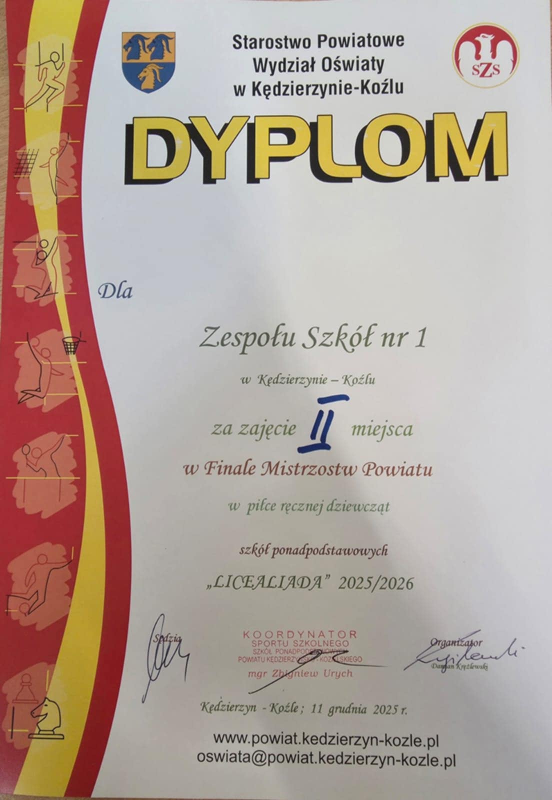 Dnia 11 grudnia 2025r w Hali Sportowej II Liceum Ogólnokształcącego w Kędzierzynie-Koźlu został rozegrany Finał Mistrzostw Powiatu w piłce ręcznej dziewcząt. W zawodach uczestniczyły cztery drużyny szkół ponadpodstawowych. W rozegraniu wszystkich zesołów Nasza drużyna dziewcząt zajęła II miejsce !