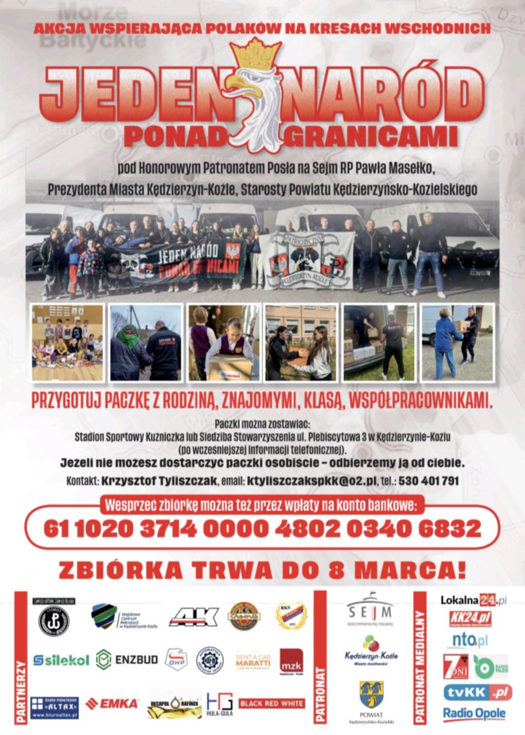 17 marca 2026r Szkolny Klub Wolontariatu Zespołu Szkół nr 1 przekazał Stowarzyszeniu Patriotyczny Kędzierzyn-Koźle 10 paczek z żywnością długoterminową dla naszych Rodaków na Kresach Wschodnich. Serdecznie dziękuję Dyrekcji, Nauczycielom, Pracownikom naszej szkoły oraz całym zespołom klasowym, w szczególności klasom 1tb, 1tż, 1kw, 2tle, 2fw, 3sw, 3w, 3f, 4tb, 4tfl, 5te za zaangażowanie się w tę akcję.